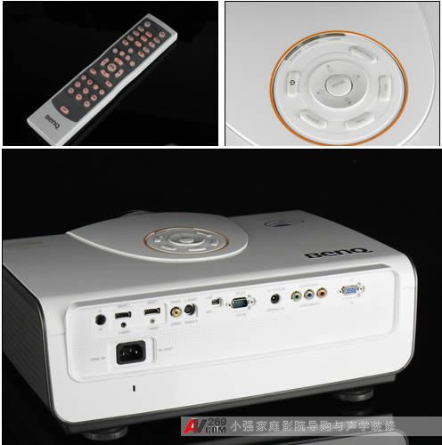 明基W5500的控制面板設計在鏡頭上方,圓形的設計看上去也很規整,同時各按鍵的布局也較為合理,可以輕松的使用。而該機的遙控器設計與電視的遙控器很像,橘紅色的背景燈設計,在黑暗的環境下也可以清楚的找到每一個功能鍵。