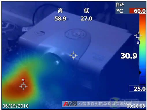 溫度投影機正常工作30分鐘,然后將溫槍對準投影機的出風口以及其機殼上部的中央位置所測試的結果。
