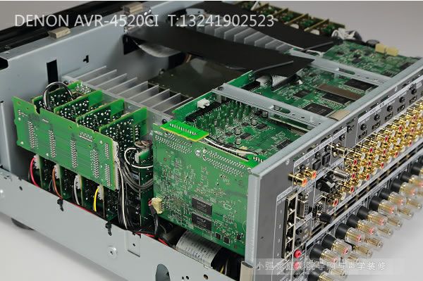 兩側(cè)散熱片旁排列了9組獨立功率放大模組,讓AVR-4520CI在8歐姆負(fù)載條件下,每聲道可提供150瓦輸出功率。