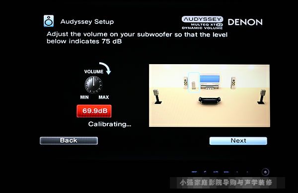 如果覺得自己動手量測、調(diào)校多聲道音場太過麻煩,內(nèi)建的Audyssey MultEQ XT32音場調(diào)校技術(shù)可以幫您輕鬆完成所有步驟,只要接上隨附麥克風(fēng)就會自動進(jìn)入量測設(shè)定畫面,接著一步一步操作即可輕鬆完成設(shè)定,最多可量測8個皇帝位。特別是超低音設(shè)定的部份,AVR-4520CI要比一般擴大機來得細(xì)膩精確,在量測低頻前,會先提醒用家先將超低音的音量調(diào)整至12點鐘位置。量測開始,畫面會出現(xiàn)紅/綠色塊,中央顯示dB值,當(dāng)?shù)皖l音量太低或太高時,畫面會以紅色色塊警示,當(dāng)音量進(jìn)入72dB~78dB的范圍時,就會變成綠色色塊,表示超低音的音量已經(jīng)調(diào)整到理想程度。