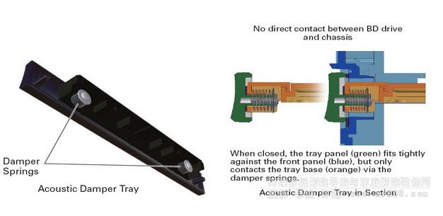 聲學吸音托盤採用托盤面板透過阻尼彈簧與托盤主體連接的設計,大幅提升吸震效果,有效消除由光碟機內部透過托盤傳達到機殼的振動干擾。