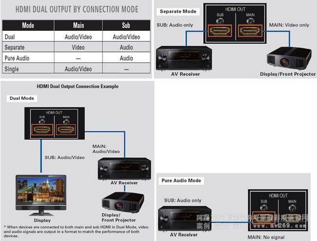 藉由雙HDMI輸出端子,音樂影像訊號可分別指派至主副端子輸出,獲得更優異的訊號傳輸,除了「分離模式」外,「雙重輸出模式」可同步輸出聲音及影像訊號至兩臺顯示器上,而「純音模式」即使連接兩臺裝置道主副HDMI端子上時,仍可提供最優質的聲音訊號輸出。
