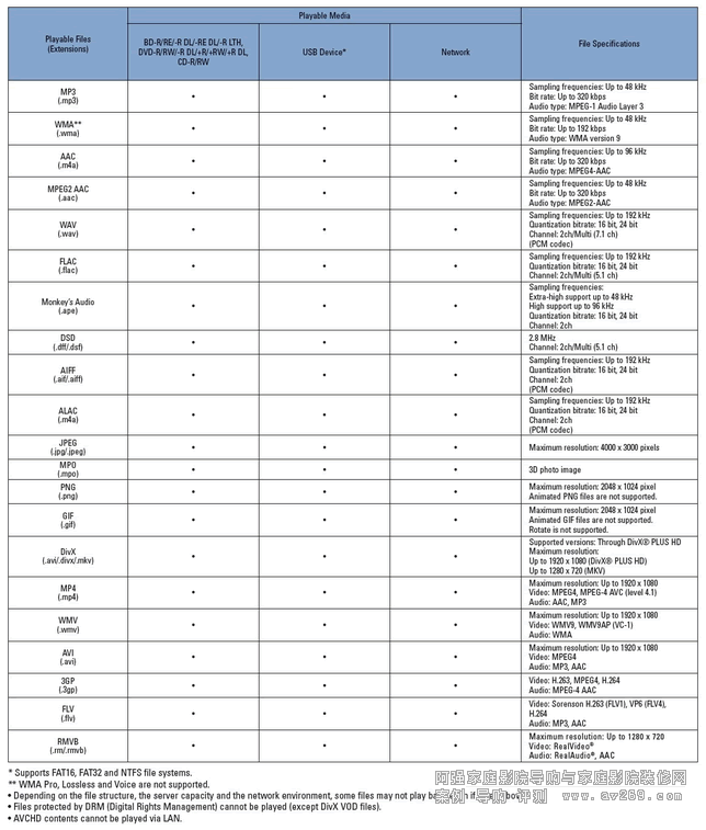 播放光碟、USB隨身碟 (FAT16/32及NTFS) 及網路連線時,可對應以下的影音格式及規格。