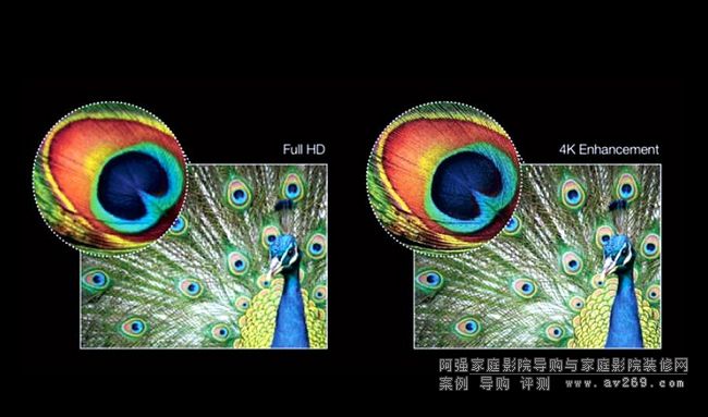 不過(guò),盡管規(guī)格大幅提高,但這三塊反射式液晶板真實(shí)解析度仍為1,920x1,080。咦,為何顯示板是Full HD解析度Epson卻強(qiáng)調(diào)「4K畫(huà)質(zhì)」為本機(jī)第三關(guān)鍵呢?原來(lái)EH-LS10000配備類(lèi)似JVC 4K e-Shift「分時(shí)顯示」的4K Enhancement技術(shù),讓液晶板畫(huà)素于投影時(shí)進(jìn)行高速斜向移動(dòng),藉此創(chuàng)造出趨近兩倍像素4K畫(huà)質(zhì)的效果。從上方這張?jiān)瓘S(chǎng)發(fā)佈的比較示意圖,可發(fā)現(xiàn)孔雀羽毛細(xì)部的解析以及畫(huà)面的立體感,經(jīng)過(guò)4K Enhancement強(qiáng)化之后都比Full HD明顯增進(jìn)。