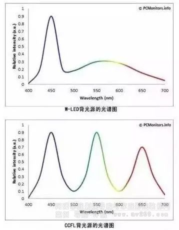 一起看看LED顯示器兩種主要發光模塊【W-LED(常用)和GB-LED】的光譜組成。如下圖: