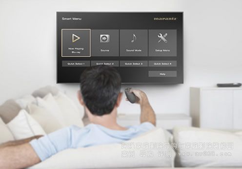 通過(guò)某些智能電視上的HDMI CEC(消費(fèi)者電子控制)功能,可以通過(guò)電視的遙控器控制SR5012。將接收機(jī)的“HDMI控制”設(shè)為ON,設(shè)置“智能菜單”接收機(jī)控制功能,通過(guò)電視機(jī)上的智能菜單主頁(yè)屏幕,您能對(duì)源和環(huán)繞聲模式選擇、主設(shè)置菜單和智能選擇配置預(yù)設(shè)進(jìn)行直接訪問(wèn)。