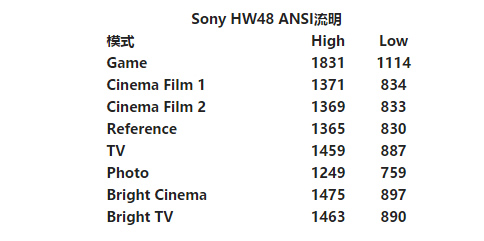 亮度。使用變焦鏡頭的最大廣角設(shè)置(對(duì)特定圖像尺寸的最短投影距離),我們測(cè)試了每種預(yù)定義模式的High和Low燈泡設(shè)置的ANSI流明,讀數(shù)如下: