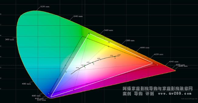 CH-LS100的分辨率為1920×1200,亮度高達4000流明,而對比度更是達到了2500000:1的影院級對比度。因此我特別對其做了一番測試,上圖就是CH-LS100在影院模式下的色域測試圖。