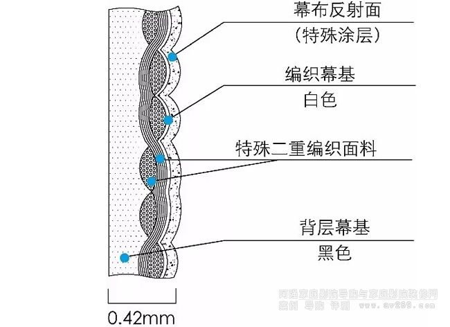HDR呢?這項技術(shù)叫做高動態(tài)對比,原本是讓畫面亮的地方更亮,暗的地方更暗。那么為了讓投影機的亮度更亮,在HF102這塊幕布上,就有一層非常細(xì)密的玻珠涂層,這個涂層會將投影機的光線匯聚,反射到觀看者的眼部,從而使畫面有一個非常高的增益,直觀來說畫面就會變得很亮。而暗部的體現(xiàn),據(jù)廠家的介紹,一個方面是幕布本身有一層玻珠能夠讓幕布有回歸幕布的屬性,避免一些雜光的干擾。另一方面因為幕布是WF302這種材料編織的,對色彩的表現(xiàn)也有提升,再就是透過幕布后還有一層黑色底層,可以吸收掉雜光,從而讓HDR的黑也能展現(xiàn)出來。因此把它稱之為HDR幕布,具體的表現(xiàn)下文中有屏攝參考。阿強家庭影院導(dǎo)購網(wǎng)