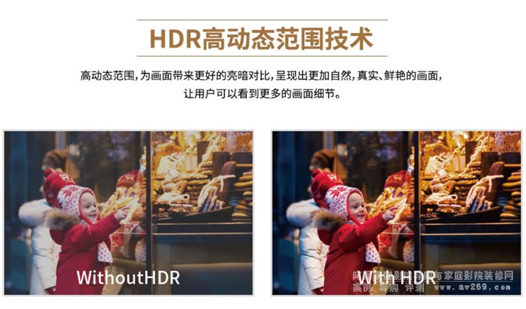 HDR高動態(tài)范圍(High-Dynamic Range)為畫面帶來更好的亮暗對比,呈現(xiàn)出更加自然,真實、鮮艷的畫面,讓用戶可以看到更多的畫面細節(jié)