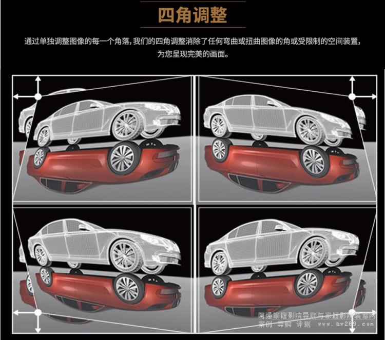 支持垂直水平梯形校正和四角校正功能,調整因投影機傾斜而導致的圖像失真