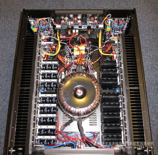 在電源供應部分H30明顯非常充沛,輸入級、驅動級和輸出級均有獨立的電源供應。兩只碩大的變壓器(立體聲狀態時,一只變壓器負責一個聲道;在橋接狀態時,一只變壓器負責一個半波訊號)重疊地安裝在機箱的中央位置。