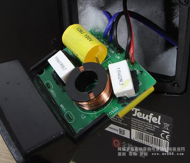 而這種扁平式的倒相孔,生產成本高,但可以很好的解決風噪的問題。當然這種設計并不是Teufel 獨家設計,獲得THX認證的低音炮中,這種設計方案還是比較常見的。不過由此也可以看出THX的高標準嚴要求。這種設計有些類似于迷宮式的箱體設計,需要多塊板材拼接,確實比一根簡單的塑料倒相管要麻煩很多。