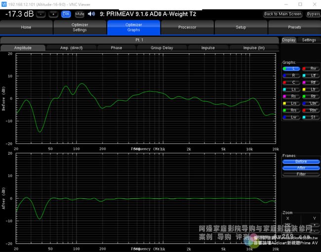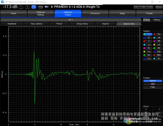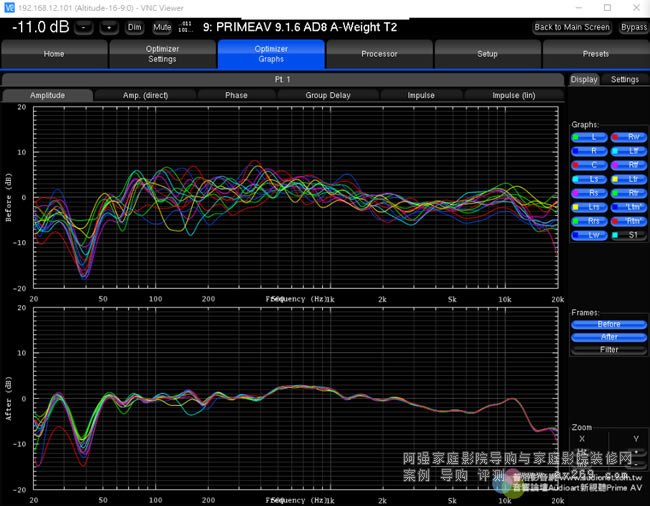 在Altitude16取得三度空間響應的精密測試數據之后,接下來就要作優化,這也正是Trinnov技術的精華所在。Trinnov Optimizer不只能作精細的頻率響應校正、距離(延遲時間)校正、各聲道喇叭與各音路相位一致性的修正,還能改善脈衝響應、使全系統能確實表現出優異的暫態特性,還能使初期反射音獲得控制、Room Mode的影響大幅降低。所有聲道喇叭實測的響應狀況(before)與優化后的結果(after)全部都明確地以圖表顯示,從頻率響應曲線觀察,就能看出響應變得非常平坦,并且各聲道喇叭的頻率響應曲線也趨于一致。