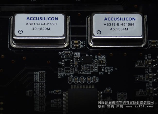 NEO X音頻解碼電路,采用了兩枚美國ACCUSILICON高精度飛秒級有源晶振(45.1584MHz和49.152MHz),分別對應44.1KHz和48KHz倍頻采樣進行管理,有效降低抖動,保證了音頻解碼的超高精準度