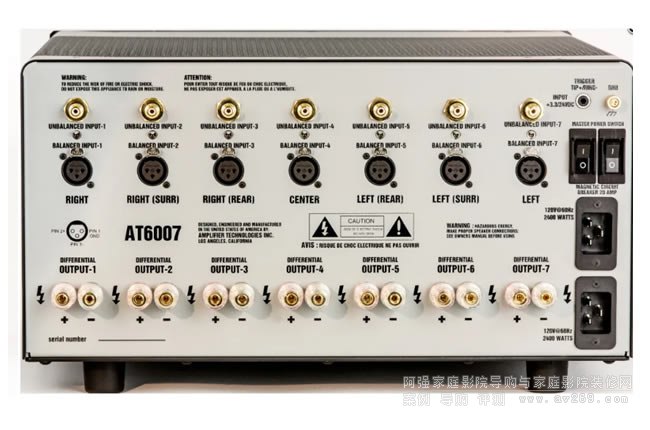↑ AT6007七聲道功放,開關和電源接口都是Double的,需要兩條電源線,必須要給它一個很好的供電以及發燒級電源線材能進一步地發揮它的性能