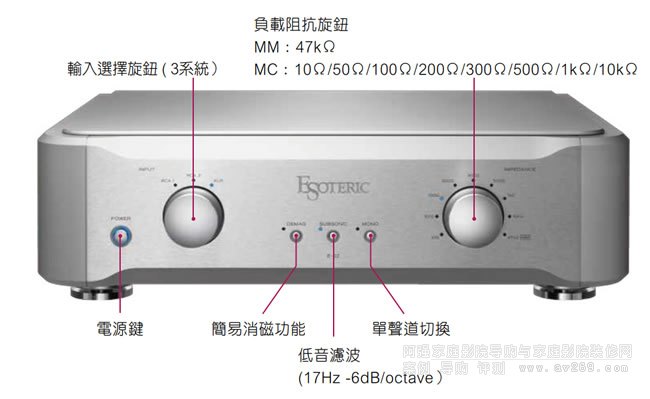 內建簡易的消磁功能,打開“DEMAG”后,唱片只需重播大約30秒,就能對MC唱頭和電壓升高的變壓器進行磁化鐵心的消磁,藉此恢復本來的音質。其他還有低音濾波(17Hz -6dB/octave),能夠消除因為唱片彎曲而產生的低頻,以及方便播放單聲道唱片的MONO切換和輸出端的切換(XLR、RCA、ESLINK Analog)。