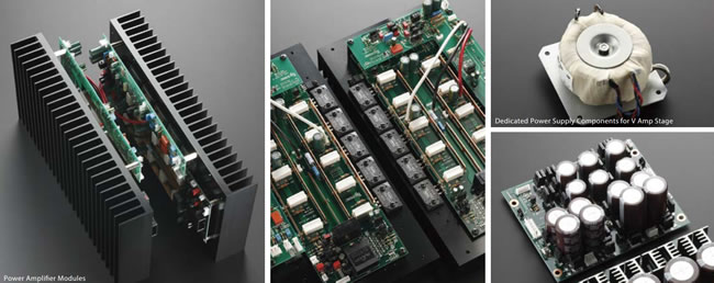 功率放大模組採用雙極LAPT晶體以五組平行推挽方式組成3段式Darlington電路,為了實現這些裝置優異的高頻特性,我們研發了簡化的放大電路,降低平行元件的數量。透過將放大級元件數量降到最低,并且刪除易引起高頻特性衰弱的輸出級線圈,維持訊號通道的完整性,使用數個匯流排,努力專注于降低內部阻抗。