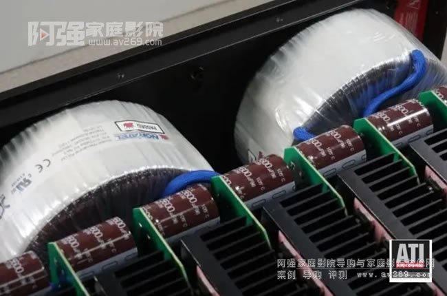 電源部分由2只環形變壓器組成,它們均為“箭豬”公司的出品。較大的一只供應4個聲道,較小的一只供應另外3個聲道
