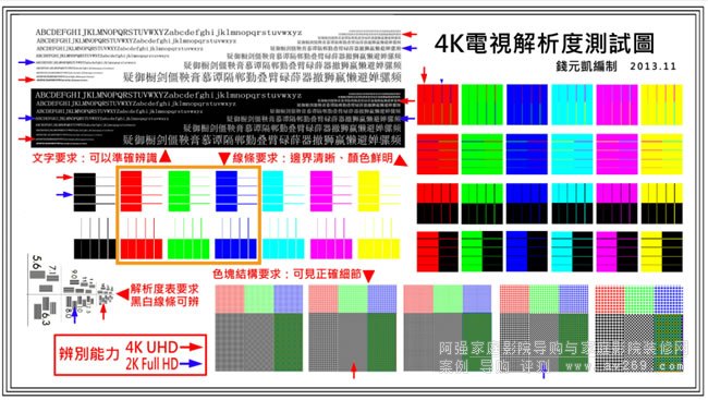 其實(shí),此次圓山音響展的EH-LS12000B新旗艦投影機(jī)發(fā)表會(huì),是由展前已經(jīng)與本機(jī)相處近三個(gè)星期的我,負(fù)責(zé)展房現(xiàn)場(chǎng)展出的影像調(diào)校,以及對(duì)專業(yè)影音媒體與資深玩家做技術(shù)重點(diǎn)解說(shuō)。 而面對(duì)眾多專家當(dāng)然不能「口說(shuō)無(wú)憑」,其中最重要的一點(diǎn)就是證明EH-LS12000B所投射出來(lái)的影像,是貨真價(jià)實(shí)有830萬(wàn)像素顯現(xiàn)的「真實(shí)4K」畫(huà)面, 我準(zhǔn)備了上面這張以3,840×2,160像素分辨率繪制的「4K電視分辨率測(cè)試圖」(原圖來(lái)自中國(guó)影音玩家,我僅將解說(shuō)部分的簡(jiǎn)體中文更改為繁體字),此圖內(nèi)紅色箭頭標(biāo)示處就是「真實(shí)4K」分辨率的考驗(yàn),如果沒(méi)有達(dá)到「真實(shí)4K」830萬(wàn)像素就無(wú)法清晰顯示(各位也可下載上圖檢測(cè)府上的4K電視及投影機(jī))。