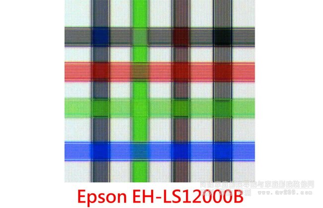 放大(或者說(shuō)靠近銀幕觀察)之后,就可以看到Epson EH-LS12000B確實(shí)可以清楚看到每個(gè)顏色的12條細(xì)線都可清楚描繪,而且最內(nèi)側(cè)十條細(xì)線各間隔「一格」、與最外側(cè)細(xì)線間隔「兩格」的差別,都可明明白白地刻畫(huà)出來(lái)。 當(dāng)我使用配備「原生4K」顯像板的Sony VPL-VW520ES播放這張測(cè)試圖,都沒(méi)有Epson EH-LS12000B如此清晰!