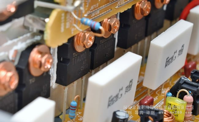 ▲安橋的Dynamic Audio Amplification概念就是用寬頻元件制作簡潔(元件數量少)、負回授低的功放電路獲得良好的暫態特性,再搭配高電流的電源并縮短供電路徑獲得高動態特性。本機每聲道使用一對最高瞬間電流可達35安培的Toshiba TTA0001/TTC0001功率晶體推挽輸出。