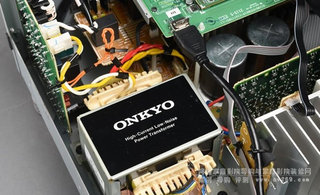 ▲RZ50的功放電路電源使用兩枚安橋訂制的15,000μF濾波電容,不僅電源電路的橋式整流與濾波電容離變壓器很近,并且為了縮短前方三聲道[從濾波電容到功率晶體的距離],原廠還很刻意把三聲道功放的前、中段另做成一塊子板(右邊立起來裝的那塊),雖然費事卻能減少功放電路的內阻、加強電流輸出能力。
