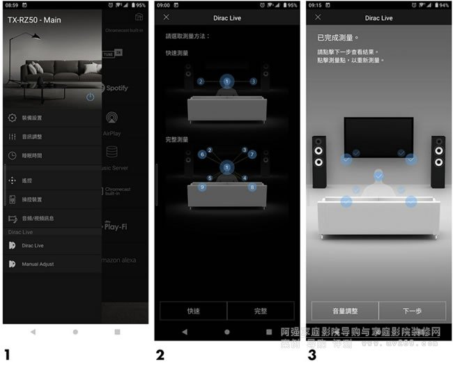 ▲我已經評過幾部應用Dirac的二聲道與環繞功放,但是我從來沒遇過像安橋這樣:用自家提供的App就能執行Dirac測試校正程序(圖1)。依照提示將測試麥克風插入RZ50后,請見圖2,接著選擇快速測量(測三個位置)或完整測量(皇帝位與周圍8個測試點)。想要得到好的結果,我強烈建議作完整測量,測完9個測試點(圖3)。