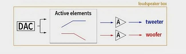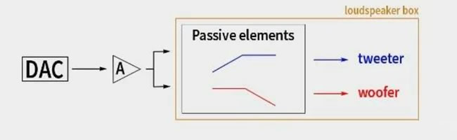 有源喇叭分兩種,一種是模擬有源,一種是數(shù)字有源。先看模擬有源,從解碼器開(kāi)始,所有的設(shè)備也都在喇叭內(nèi),經(jīng)過(guò)DAC后,需要進(jìn)行分頻器分頻。