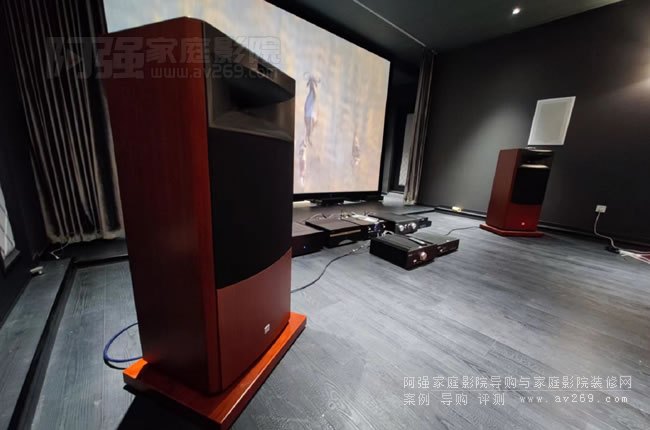 這是整個影音室的空間設備規劃參考,我們接觸的時間節點較晚,部分設備線路已經預留并鎖定,在原來的基礎上我們增設側環繞兩只,畫面增大到220-230英寸,采用高增值固定透聲幕,前期的思路是希望業主購置的8年前的索尼投影機可以用上,后部增設薄地臺和前面的幕布處地臺相呼應。