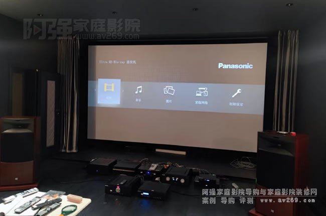 幕布前的影音設備兩排擺開,前面為HIFI設備,采用合并式音樂功放和CD轉盤。后面是多聲道家庭影院系統,前后級和威動影庫和松下4K碟機做音源。