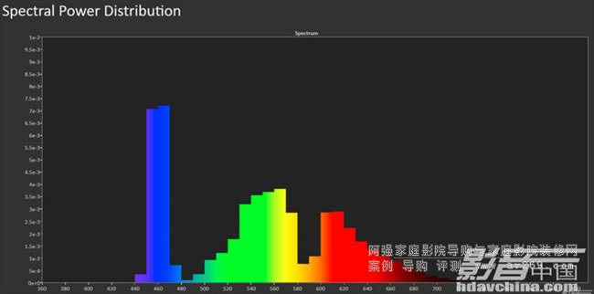 從光譜能量分析圖中,我們可以發(fā)現(xiàn)藍(lán)光擁有最高的光譜能量,主要集中在460-470nm區(qū)間,綠光能量則是在540-570nm區(qū)間,紅光能量在600-620nm區(qū)間
