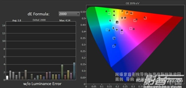 在HDR與BT.2020色域ColorChecker色準(zhǔn)測試中,XW7000在原生預(yù)設(shè)畫面模式下,平均dE2000誤差值為1.8,同樣也低于人眼可識別的誤差值范圍