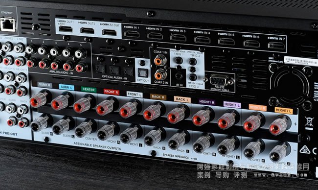 支持了15.2聲道處理,除了兩組低音炮Pre-out之外,還有15組環繞聲道Pre-out。