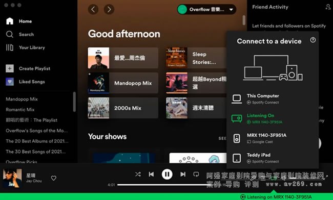 支持了AirPlay 2、Chromecast及Spotify Connect,連接到同一網絡之后就可以方便地選擇MRX 1140播歌。