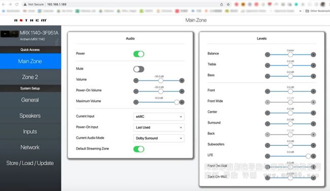 MRX 1140的前面板設有液晶顯示屏,方便調校和設定各種擴音機參數,電視畫面也會顯示對應的設定菜單。如果覺得文字界面和遙控器操作不夠直觀就手的話,提供了相當精美的Anthem Web User Interface,通過網頁界面來進行設定。只要在電腦或者手機打開瀏覽器,輸入MRX 1140的IP地址(可在Setup→Network→Network Status找到,常見為192.168.0.xxx或者192.168.1.xxx),就可以連入擴音機,設定Main Zone、Zone 2、Speakers、Store/ Load/Update等不同設定,手機可以進行輕觸式操作。