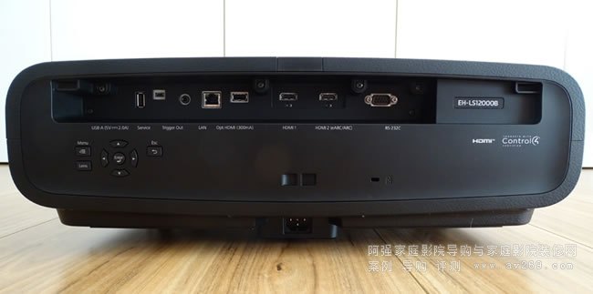 連接位于投影儀的背面,由兩個 HDCP 2.3 HDMI 輸入組成,第二個 HDMI 輸入上提供 eARC/ARC。您還可以找到一個 USB A、RS232c、輸入、以太網(wǎng)連接和一個 3.5 毫米迷你插孔。
