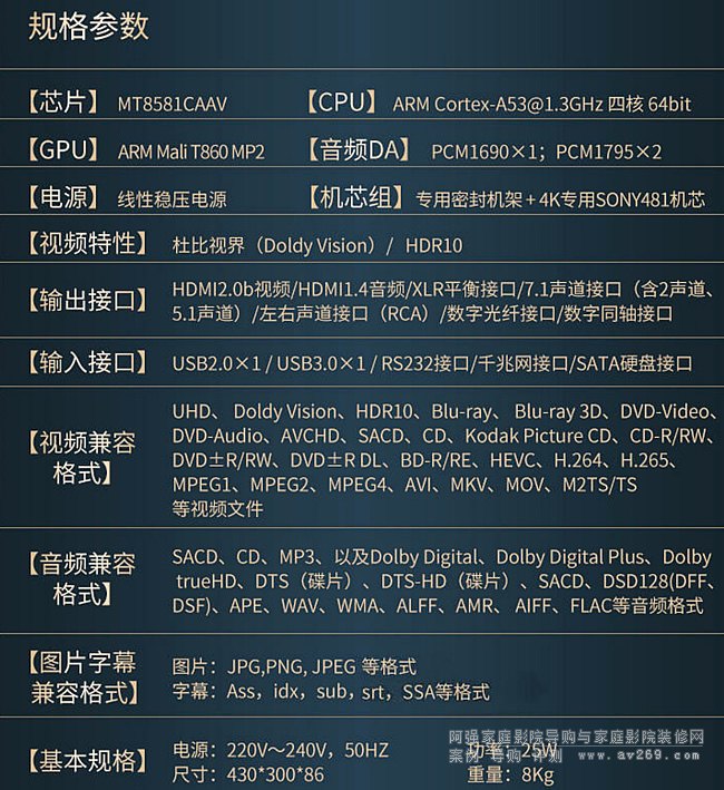 擁有DTS-HD、藍光3D、DOLBY聲音、DOLBY視界等認證,支持杜比視界輸出;