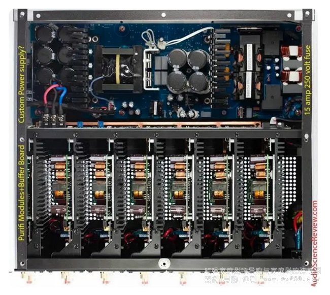 供電部分是開關(guān)電源,它被置于另一個空間里面,由于要同時供給7個功放,這塊開關(guān)電源的功率很大,所以電路板的面積占據(jù)了底板的一半。通過電源部分的保險絲可以看到,它的規(guī)格是15A/250V。可就是說,能提供給功放的最大功率是3750W。