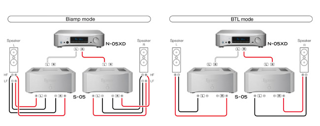 ● 有STEREO(30W輸出/8歐姆, 60W/4歐姆)、BTL(橋接,120W/8歐姆)、BI-AMP雙擴大機三種模式可以切換使用,BTL與BI-AMP都需要兩臺S-05,如何連接請詳閱說明書,或是請購入的店家代為安裝。 簡單來說BTL就是將每一臺S-05當單聲道后級使用,BI-AMP則適用喇叭為BI-WIRING設計時,每一部S-05單獨驅動單邊喇叭的高音與低音,因此使用BI-AMP時,喇叭線共需要兩對。