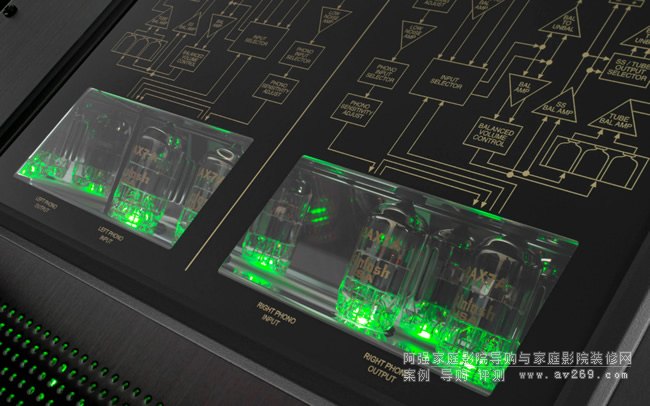 ▲C12000頂蓋上可以看到的四支真空管是負責唱頭放大,使用四支的原因是平衡架構。 頂蓋上還可看到前級的方塊圖,這種設計也是McIntosh的傳統。