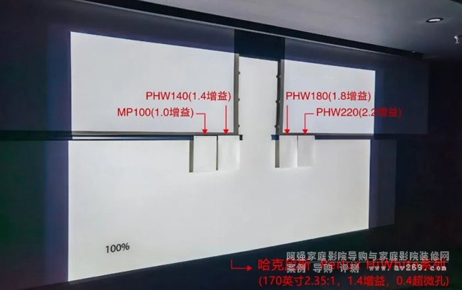 從實際測試來看,在偏離屏幕中心40°屏攝,PHW140的亮度有一定下降,跟1.0增益的MP100幾乎一樣;PHW180樣幕偏離屏幕中心的角度更大(約50°),亮度略低于PHW140;PHW220由于偏離中心角度最大(約60°),同時由于高增益導致半增益視角較小,在側向觀看的亮度反而最低。這張屏攝直觀地展示了屏幕增益系數和視角的關系,為設計影院時的增益選擇提供參考,各幕樣基本符合harkness官方的可視角度數據。