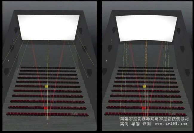 所以,在家庭影院設計中,如果以屏幕中心增益1.4或1.8為標準來設計影院亮度,側方觀眾位的觀影亮度下降較小,所有人都能看到良好的觀感亮度;如果以屏幕中心增益2.2為標準來設計影院亮度,側方觀眾位的亮度下降會比較明顯,這種情況下,建議可以考慮使用弧形幕,來提升側方觀眾位的觀影亮度。