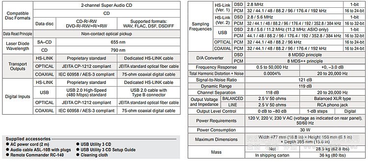 金嗓子Accuphase DP-770 SACD碟機搭載外轉子無刷直流電機驅動的高剛性、高精度驅動橫移機構,可平穩地旋轉圓盤并提供準確的數據讀取,而驅動ES9028 PRO(ESS Technologies)處理器的8MDSD(DSD信號)/8MDS++(PCM信號)D/A型轉換器在8個并行通道中將輸入轉換為高精度的模擬信號。DP-770 還集成了 ANCC* 等多種噪聲抑制技術,可打造無與倫比的音樂體驗。