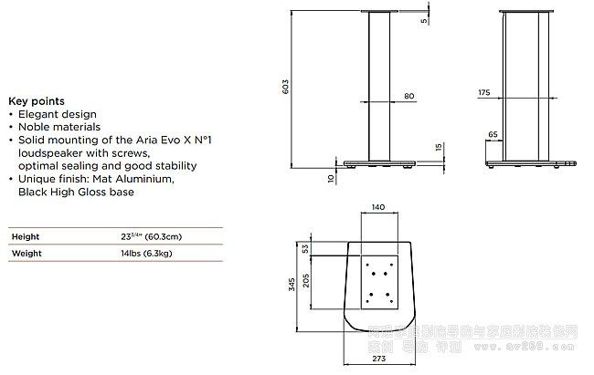 這些支架高24” (60.3 cm),專為Aria Evo X N°1揚聲器設計,可將固定在黑色光滑金屬板上的揚聲器抬升高度,進行展示。作為可額外選購的配件,這些啞光黑色鋁制支架包含一個電線通道,讓您實現(xiàn)最佳耦合,讓安裝更加隱蔽。支架造型時尚,十分穩(wěn)固,還搭配了一個優(yōu)雅、黑色光澤的鋼化玻璃底座。