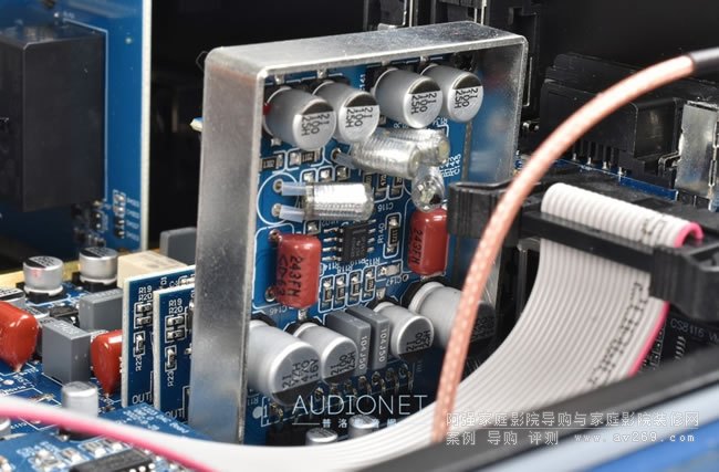 C 389的前級電路做得很正規(guī),它的Phono Stage是裝在一個小金屬殼里面( 下圖 ),有考慮到屏蔽( 降低噪聲 ),此處使用的放大元件是低噪聲低失真、JFET 輸入雙OP Amp芯片OPA1652,前級的訊源選擇與音量控制采用JRC NJW1194,前級的放大組TI OPA1688A與SG Micro SGM82612兩種雙OPA芯片,我判斷后者應(yīng)該是用在.2( 超低音)聲道。