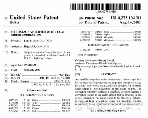 Hegel一直以來很強調Sound Engine技術,應用到Hegel的放大器里面,在2001年還申請了專利(專利號為US 6.275.104),名字為MULTISTAGE AMPLIFIER WITH LOCAL ERROR CORRECTION,是一種修正多級放大電路失真的技術。在Hegel的官網里面如此形容:The Hegel SoundEngine technology is not using any kind of global negative feedback, it is using local and adaptive feedforward technology。意思就是不使用大環路反饋,只是局部使用反饋以及自適應前饋技術。