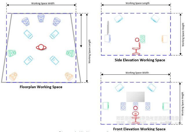 觀看工作室的側視圖,垂直于前面和后置揚聲器應在30°到55°之間。俯瞰演播室的后視圖,左右的垂直角度側置揚聲器應在45-55度范圍內。