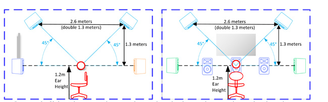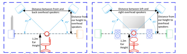 理想的45度垂直角度可以通過保證距離來實現從前置揚聲器到后置揚聲器是雙倍從耳朵高度垂直向上到頭頂揚聲器的距離。