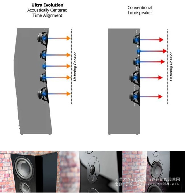 時間對齊箱體結(jié)構(gòu):Ultra Evolution Pinnacle 采用了全新的時間對齊箱體結(jié)構(gòu),弧形前障板將所有驅(qū)動單元對準一個垂直平面,確保聲音在完全相同的瞬間到達您的耳朵,實現(xiàn)了相位一致性的最大化。